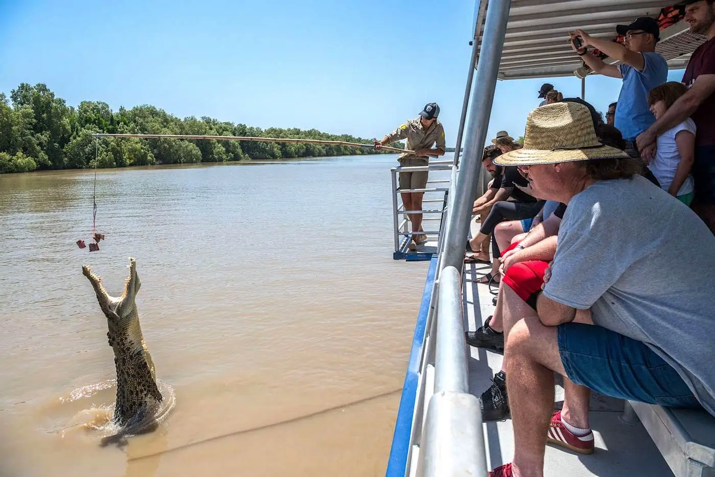Every jumping croc tour is safe, comfortable and undercover, so you can enjoy the cruise no matter what level of fitness or mobility. After all, everyone should be to witness to power of the mighty Australian Estuarine (Saltwater) Crocodile. All of our cruises have a minimum of 2 crew members on board so that while the action is happening in front of you, you can rest assured that our experienced Skippers are concentrating on keeping both their passengers and the animals as safe as possible.
